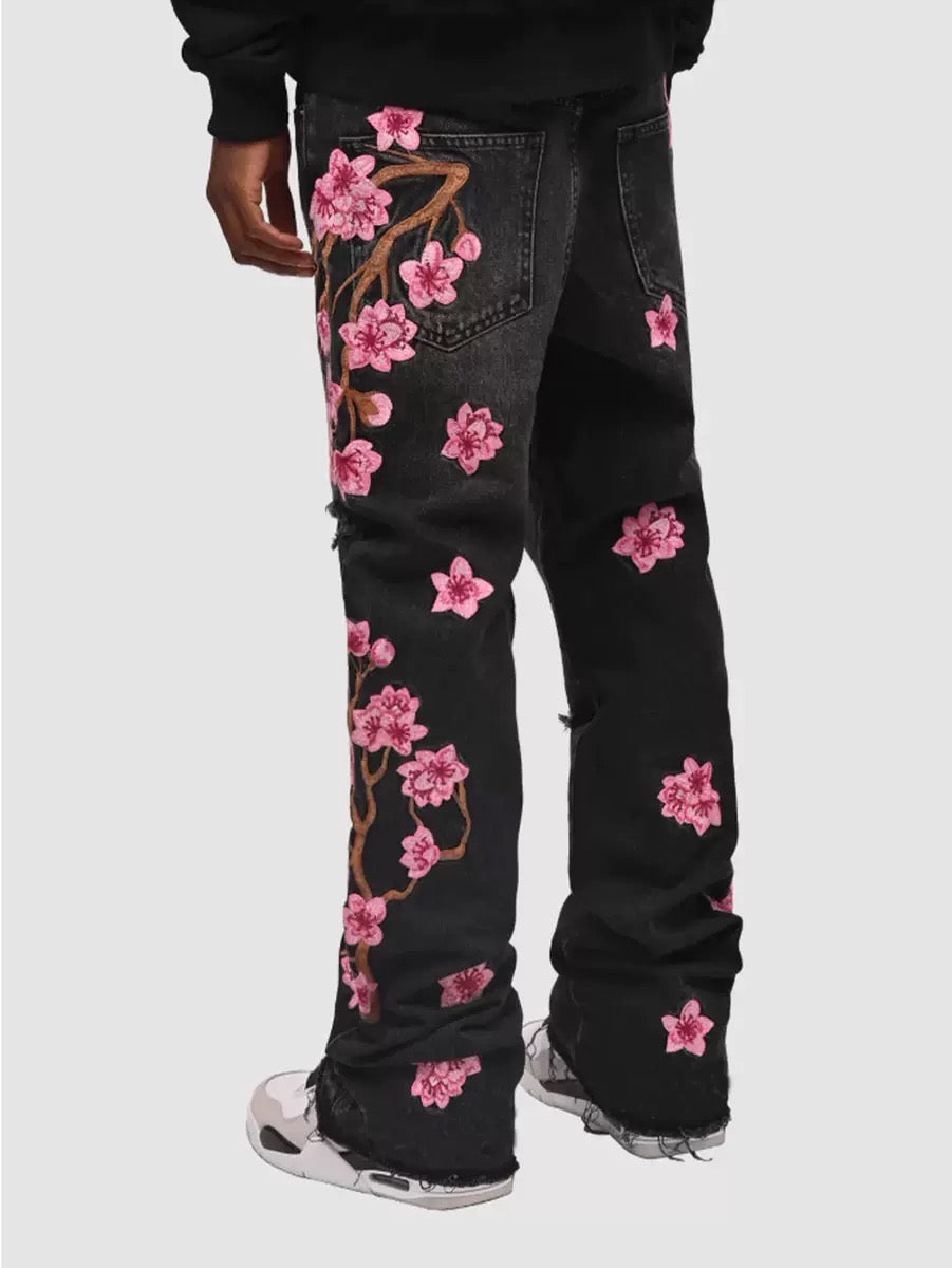 - High-Waist-Jeans aus schwarzem Denim mit Blumenstickerei